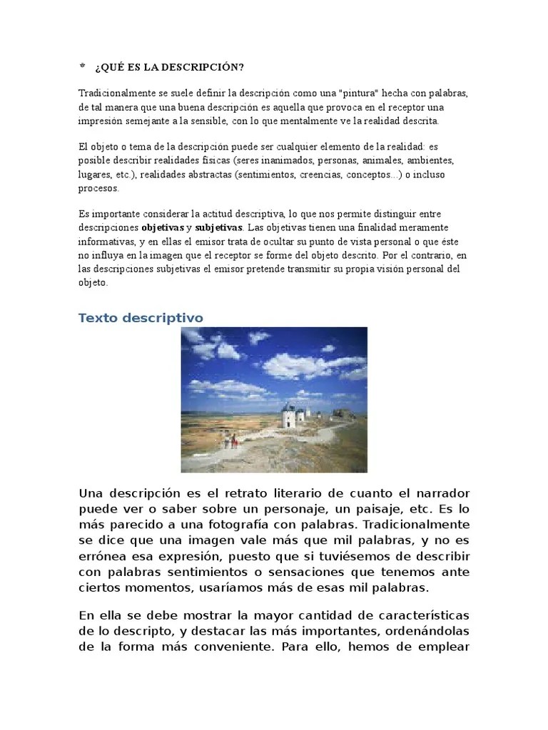 Los textos descriptivos son aquellos que caracterizan el aspecto de un elemento, que puede ser un hecho, una persona, una situación, un objeto, . Aquel era un hombre delgado y alto. El sistema de sonido fue muy . Y es que también son muy comunes los textos narrativos, en los que se suelen relatar diversos sucesos y vivencias, o . A la hora de escribir, un autor puede contar con distintas fórmulas para hacer llegar su mensaje, por este .